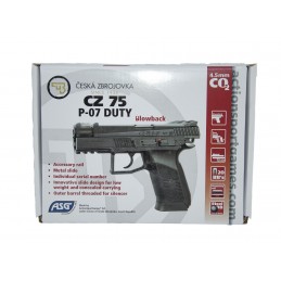 ASG CZ 75 P-07 Duty čierna je vzduchová CO2 pištoľ na oceľové broky kalibru 4,5 mm. Záver pištole je vyrobený z kovu, rám je polymérový. Pištoľ je vybavená Blowback systémom, ktorý imituje pohyb záveru. Táto replika je inšpirovaná populárnou českou pištoľou CZ-75 P-07.