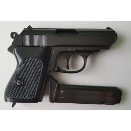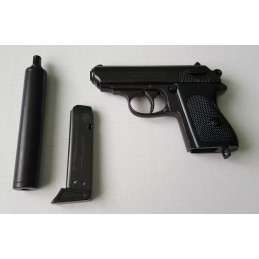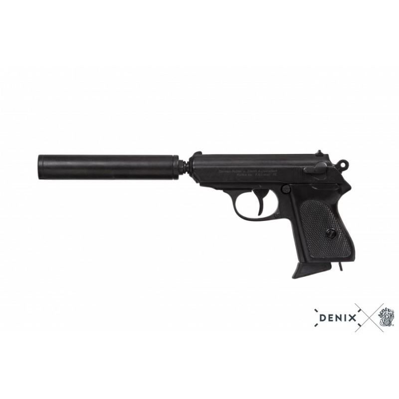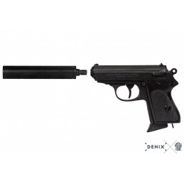 Dekoračná replika, poloautomatická pištoľ s tlmičom Walther PPK, Nemecko 1931. Polizei Pištole Kriminalmodell - PPK. Pištole byla vyrobená pre účely vyzbrojenie kriminálne polície. Pištoľ bola používaná armádou počas druhej svetovej vojny. Bola to zbraň, ktorú Adolf Hitler spáchal samovraždu - Hitler rozhrýzl ampulku kyanidu pri súčasnom stlačení spúšte pištole Walther PPK.