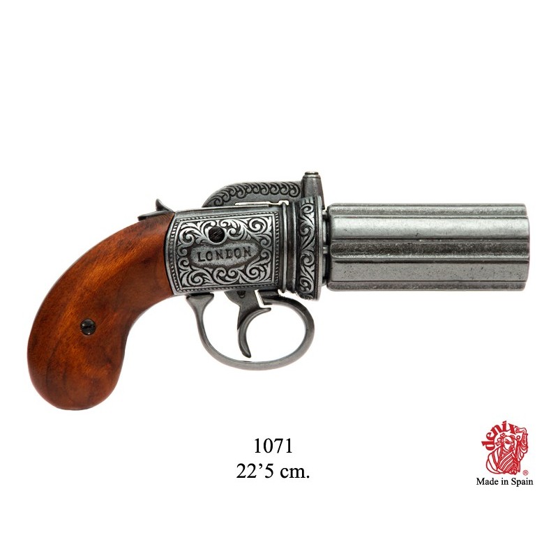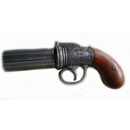 Dekoračná replika, revolver Pepper-box. Mechanizmus otáčania hlavne je funkčný. Pri stlačení spúšte revolver cvakne.