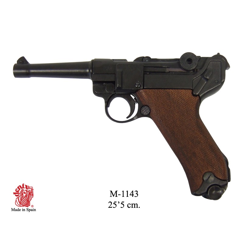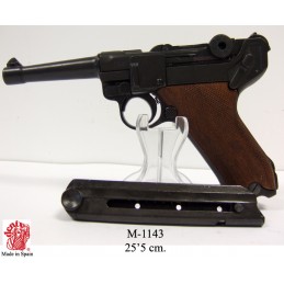 Dekoračná replika nemeckej pištole Parabellum Luger. Pištoľ bola používaná za 1. a 2. svetovej vojny. Replika má pohyblivé súčasti, možno natiahnuť a stlačiť spúšť. Zásobník je vyberateľný. Replika je vyrobená z kovu, črienky sú drevené.