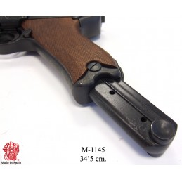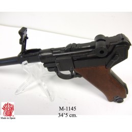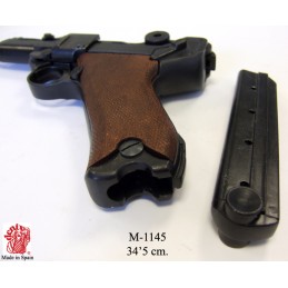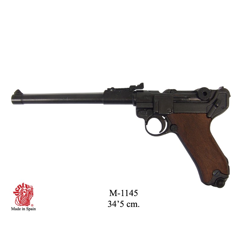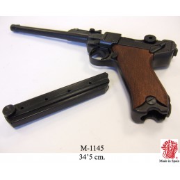 Dekoračná replika delostreleckej pištole Parabellum Luger, Nemecko 1917. Replika má pohyblivé súčasti, možno natiahnuť a stlačiť spúšť, hľadí je nastaviteľné. Zásobník je vyberateľný. Replika je vyrobená z kovu, črienky sú drevené.