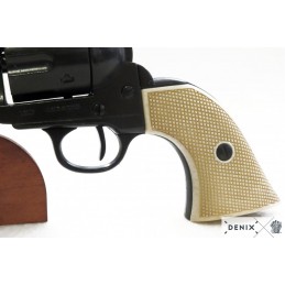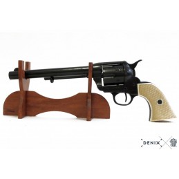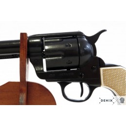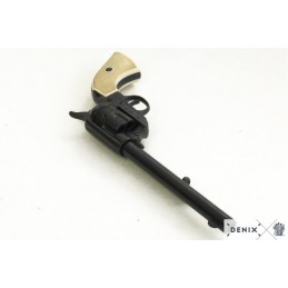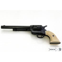 Dekoračná replika, revolver USA 1873, kaliber 45, 7 1/2'. Mechanizmus je pohyblivý. Možno natiahnuť a po stlačení spúšte revolver cvakne. Vyrobené v čiernej povrchovej úprave. Rukoväť je vyrobená z imitácie slonoviny. Bubienok sa otáča.