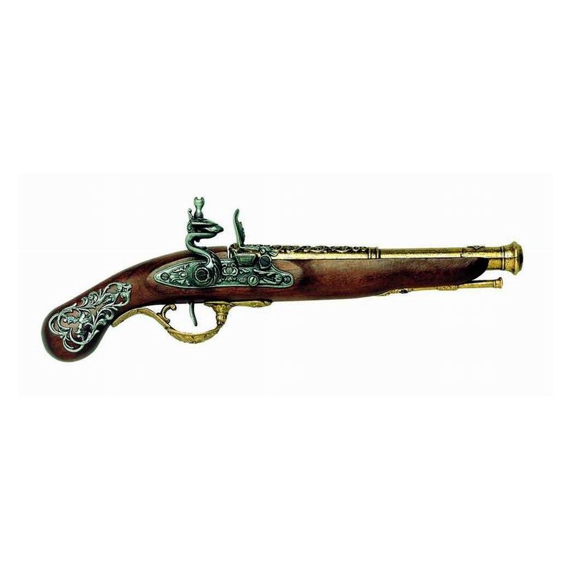 Dekoračná replika anglickej pištole z 18.století. Pištoľ má pohyblivý mechanizmus. Mosadzná povrchová úprava.