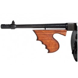 Pokiaľ hľadáte autentickú dekoráciu z obdobia druhej svetovej vojny, potom by vás mohla zaujímať replika amerického samopalu Thompson 1928 M1 s bubnovým zásobníkom, ktorý poňal päťdesiat nábojov. Táto dekoratívna replika vyzerá úplne skvele. Bubnový zásobník dodáva tejto replike veľmi realistický vzhľad a zvyšuje tak jej autenticitu. Je možné ho ľahko vybrať a opäť nasadiť, čo zjednodušuje manipuláciu s touto replikou. Navyše, pohyblivý mechanizmus umožňuje naprázdno natiahnuť zbraň a po stlačení spúšte replika cvakne.