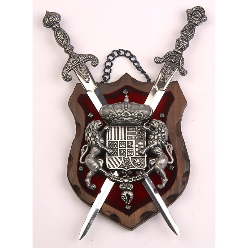 Replika erbu s dvoma zbraňami a vyobrazenými levmi na drevenom podklade. Povrchová úprava kovu je upravená vo strobylém, striebornom prevedení a drevená doska je pre luxusný vzhľad potiahnutá červeným zamatom.