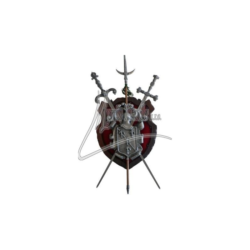 Replika erbu s dvoma zbraňami na drevenej doske.