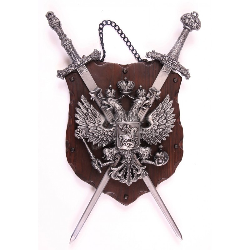 Replika erbu s dvoma zbraňami na drevenej doske.