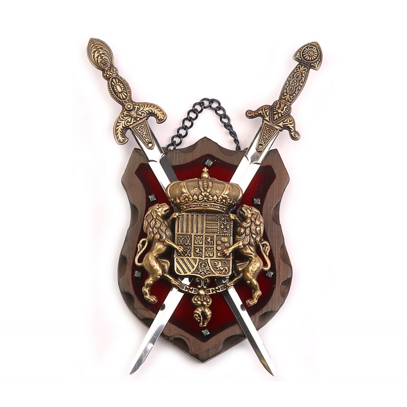 Replika erbu s dvoma zbraňami a vyobrazenými levmi na drevenom podklade. Povrchová úprava kovu je upravená vo strobylém, bronzovom prevedení a drevená doska je pre luxusný vzhľad potiahnutá červeným zamatom.