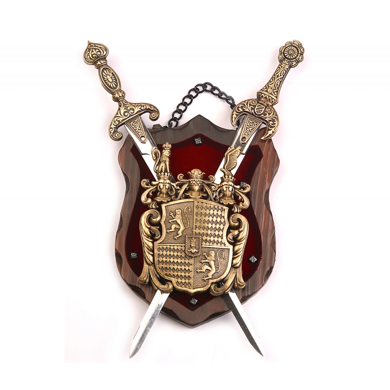 Dekoračná replika rytierskeho erbu s dvoma zbraňami na drevenej doske. Povrchová úprava kovu je upravená vo strobylém, bronzovom prevedení a drevená doska je pre luxusný vzhľad potiahnutá červeným zamatom.