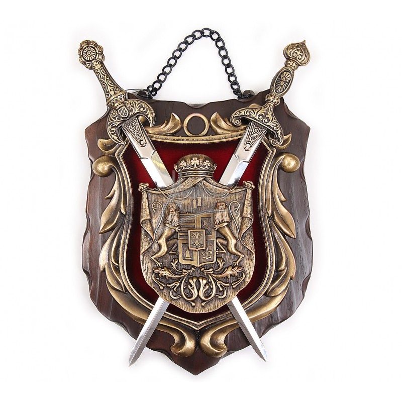 Replika erbu s dvoma zbraňami na drevenej doske.