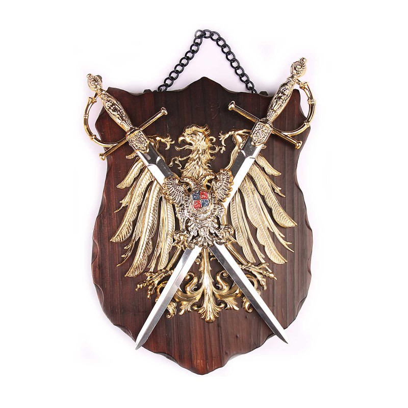 Replika erbu s dvoma zbraňami na drevenej doske.