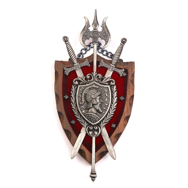 Replika erbu s dvoma zbraňami na drevenej doske.
