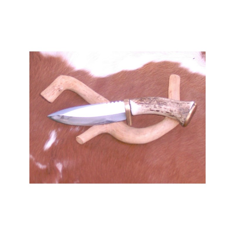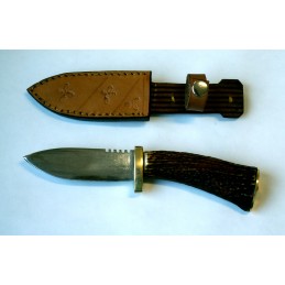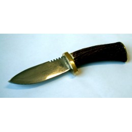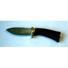 Funkčný poľovnícky nôž. Ručná výroba. Lovecký nôž s pevnou čepeľou. Dĺžka čepele tohto loveckého noža je 100 mm, šírka čepele 30 mm a celková dĺžka je 220 mm. Čepeľ je z čiernej ocele, kovanie mosadzné, strenky sú z jeleního paroha.
