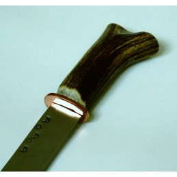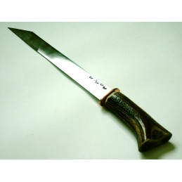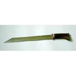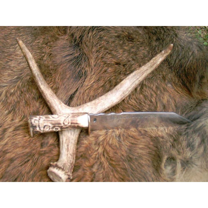 Funkčný poľovnícky nôž s pevnou čepeľou. Ručná výroba. Dĺžka čepele: 100 mm, šírka čepele: 30 mm a celková dĺžka: 430 mm. Čepeľ je z čiernej ocele, kovanie mosadzné, črienky z jeleního parohu.