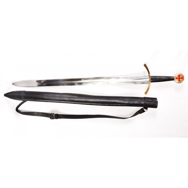 Replika križiackeho meča vrátane kožené pošvy s pásikom. Meč je vyrobený z ocele, s mosadznou rúčkou a s koženou rukoväťou.