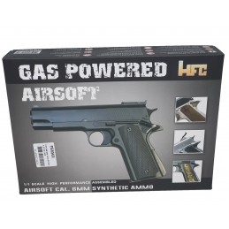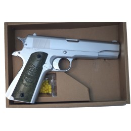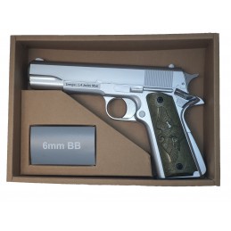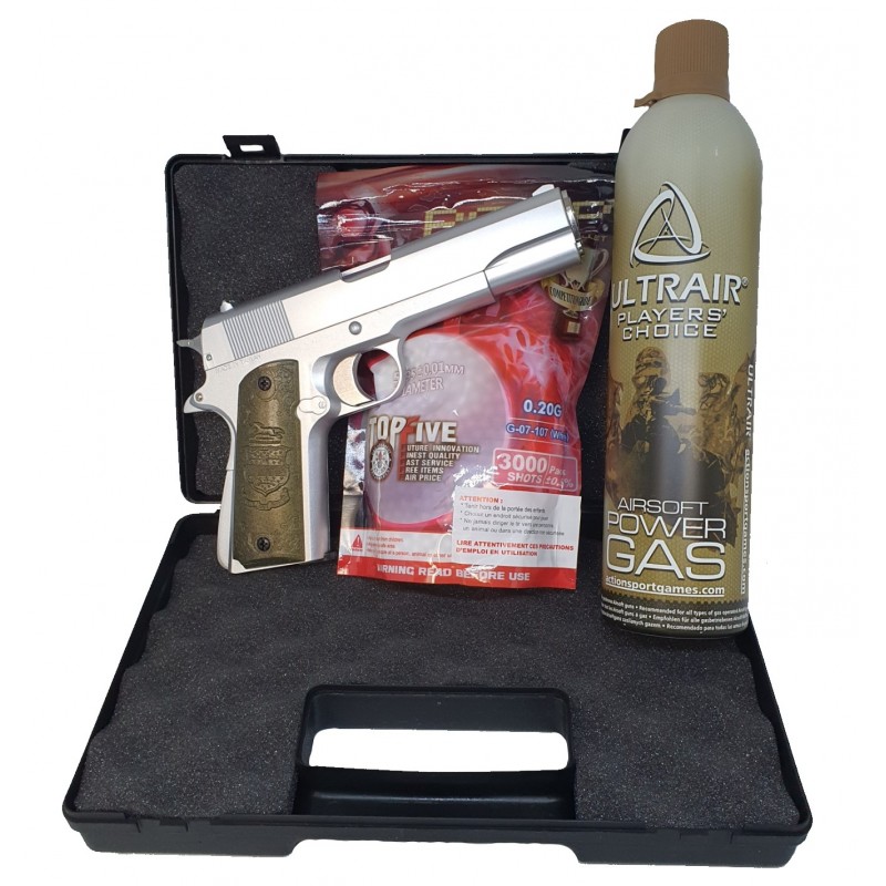 Skvelá replika slávnej pištole Colt 1911 v poloautomatickej plynovej verzii s pevnou hlavou valcov. Vďaka tomuto systému má tento model veľkú autonómiu. V závislosti na použitom plyne môže rýchlosť projektilov dosiahnuť 107 m/s (s guličkami 0,20 g). Pištoľ je vyrobená v striebornom prevedení, črienky s vyobrazením orla a erbu. Zbraň je dodávaná v kartové krabici s potlačou.