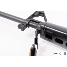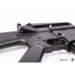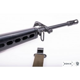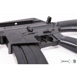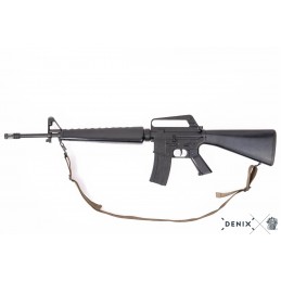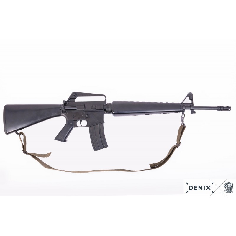 Replika útočnej pušky M16A1 je vyrobená z kovu a plastu, s popruhom, simulovaným mechanizmom nabíjania a streľby a odnímateľným zásobníkom.
